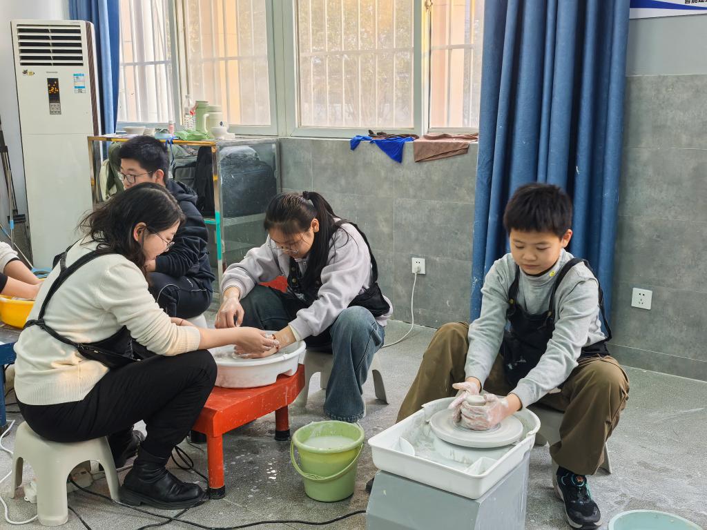 活动中,爱陶社指导教师孙若楠不仅讲解了陶艺的基本技艺,更着重介绍了徐州本地陶艺的历史脉络与非遗价值。从古陶文化的传承到现代陶艺的创新,老师通过实物展示与故事讲述,让同学们在动手之前,先与千年陶文化进行了一场“对话”。在实践环节,孩子们在专业指导下尝试拉坯、刻画、釉彩等传统工序,每一道步骤都凝结着非遗技艺的智慧与温度。活动现场,陶轮转动,泥坯成形,孩子们专注的眼神与小心翼翼的动作,映照出对传统手艺的敬畏与兴趣。