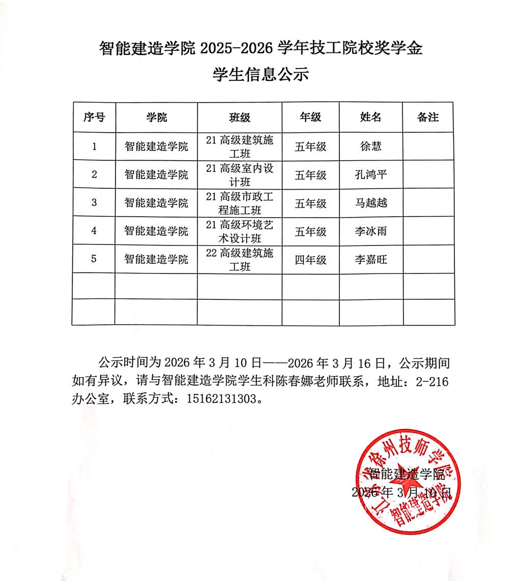 智能建造学院2025-2026学年技工院校奖学金学生信息公示